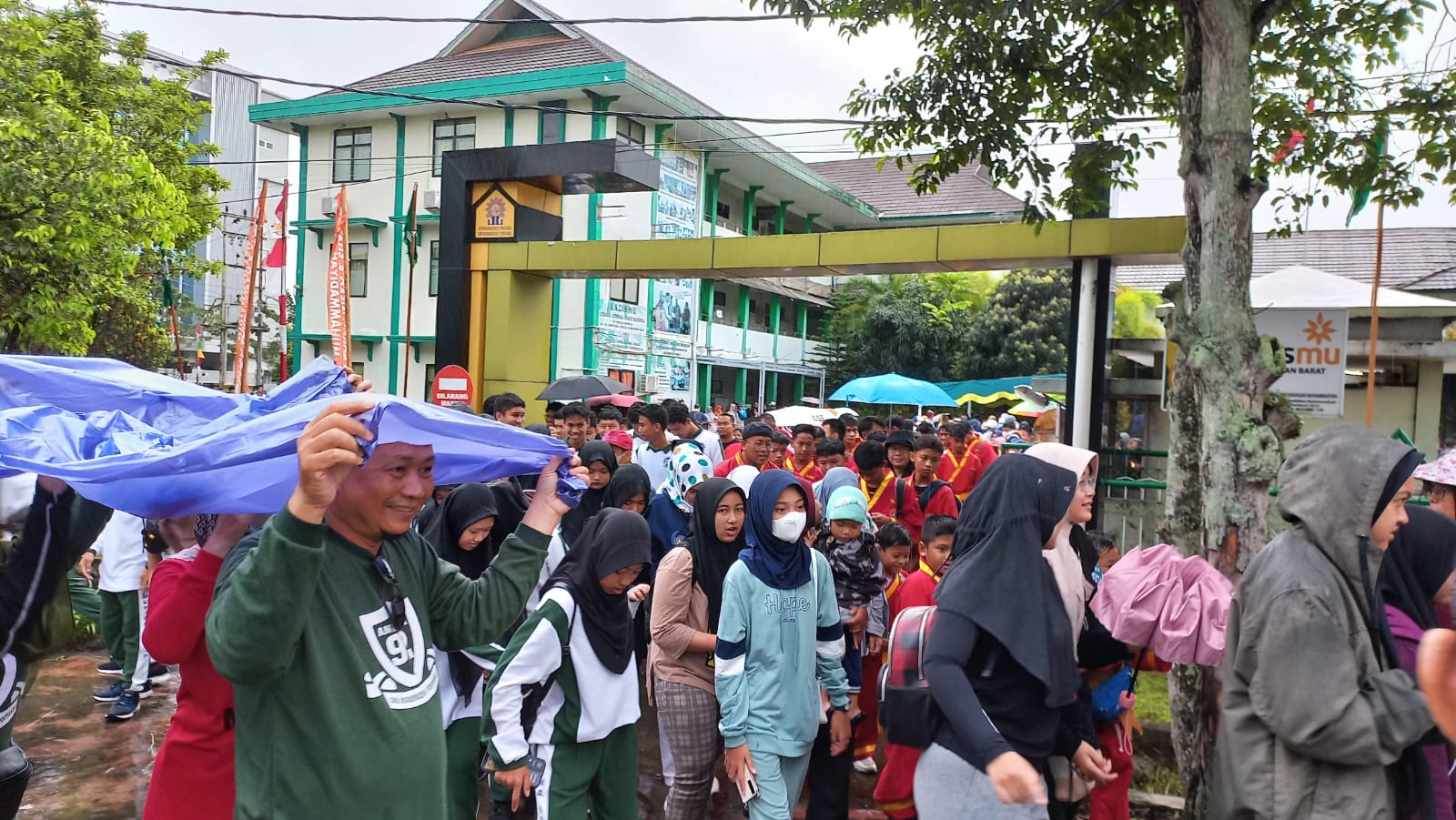 Para peserta dilepas Ketua Pimpinan Wilayah Muhammadiyah (PWM) Kalbar Dr Pabali Musa, saat hujan masih turun rintik-rintik. Sebagian peserta terlihat melindungi diri dengan payung dan jas hujan ketika mengikuti jalan sehat.