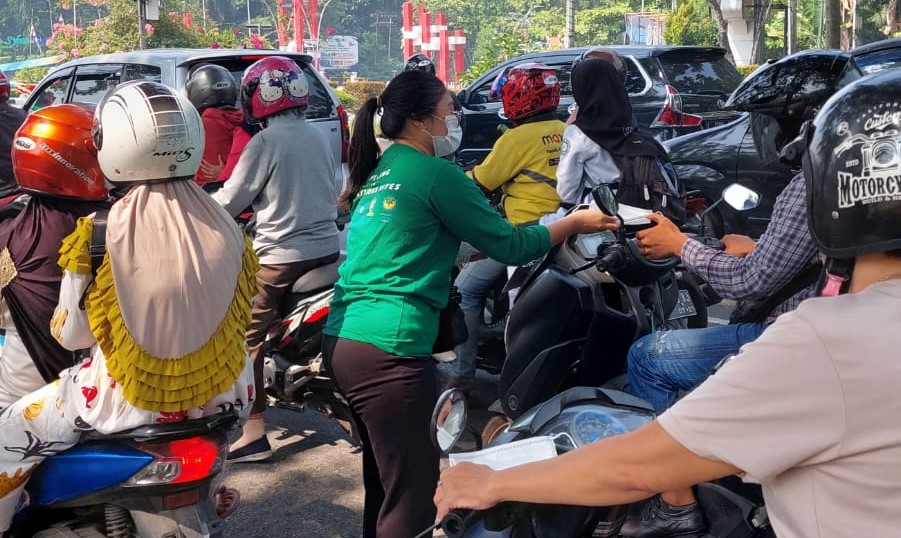 Dengan bermodalkan ribuan masker kegiatan ini dimulai dari pukul 09.00 hingga lewat dari pukul 10.00 WIB.lewat. Empat titik lampu merah di Untan menjadi sasaran utama dalam membagikan masker dan bendera tersebut. Adapun masker-masker ini sebagian dari sumbangsih penerbit Airlangga dan Nasyiatul Aisyiyah.