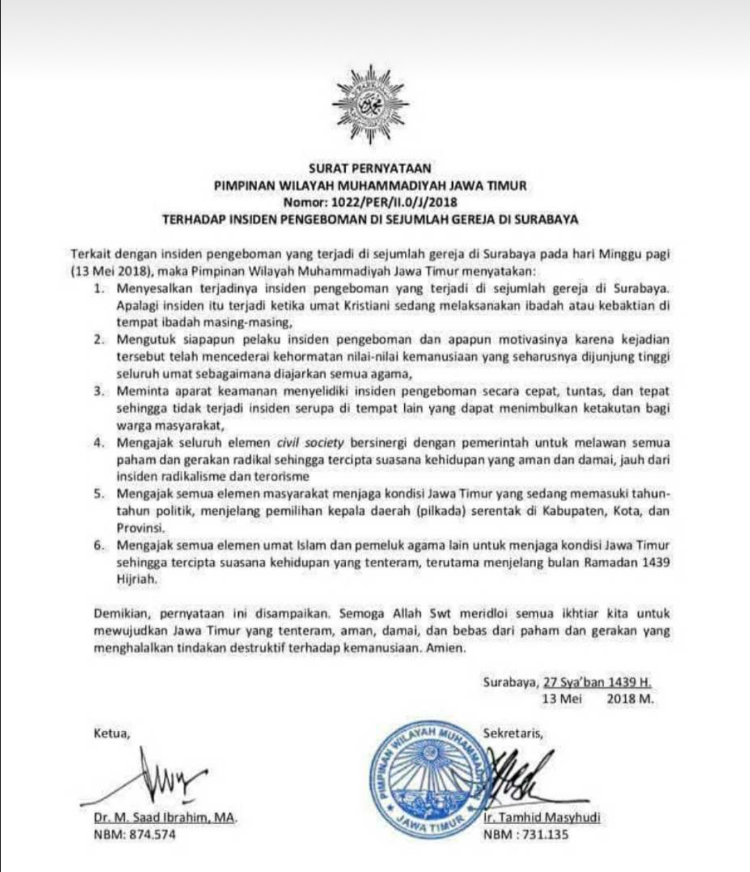 Melalui surat bernomor: 1022/PER/II.0/J/2018 yang ditandatangani oleh Ketua PWM Jatim Dr KH Saad Ibrahim MA bersama Ir Tamhid Masyhudi, PWM Jatim menyatakan sikapnya terkait insiden pengeboman yang terjadi di tiga gereja di Surabaya.
