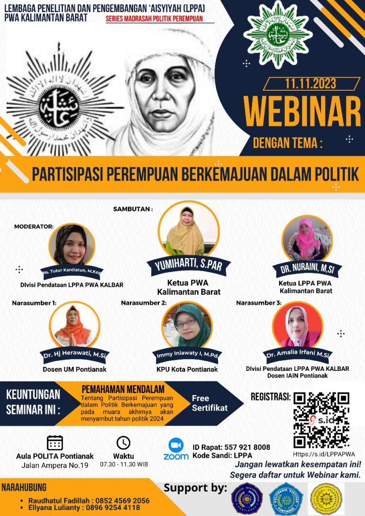 MYKALBAR.COM – Tinggal menghitung hari pemilihan umum yang ditunggu-tunggu oleh seluruh rakyat Indonesia berlangsung. Isu-isu politik pun mulai berkembang luas, untuk menarik simpati atau membuat antipati masyarakat terhadap lawan. Efek yang berujung pada hal destruktif tersebut, tidak hanya membuat netizen pengguna medsos terprovokasi kearah negatif, tetapi akan merusak tatanan berpolitik sehat generasi penerus, yang pada akhirnya akan membangun stigma buruk terhadap politik. Atas dasar kegelisahan tersebut maka Lembaga Penelitian dan Pengembangan ‘Aisyiyah PWA Kalimantan Barat, mengadakan webinar dengan tema Peran Politik Perempuan, sebagai bagian tugas dan kewajiban untuk mengedukasi masyarakat khususnya perempuan agar tidak kaku dan takut berpolitik. Tetapi sebaliknya berani mengambil posisi terbaik agar bermanfaat bagi masyarakat dan umat.