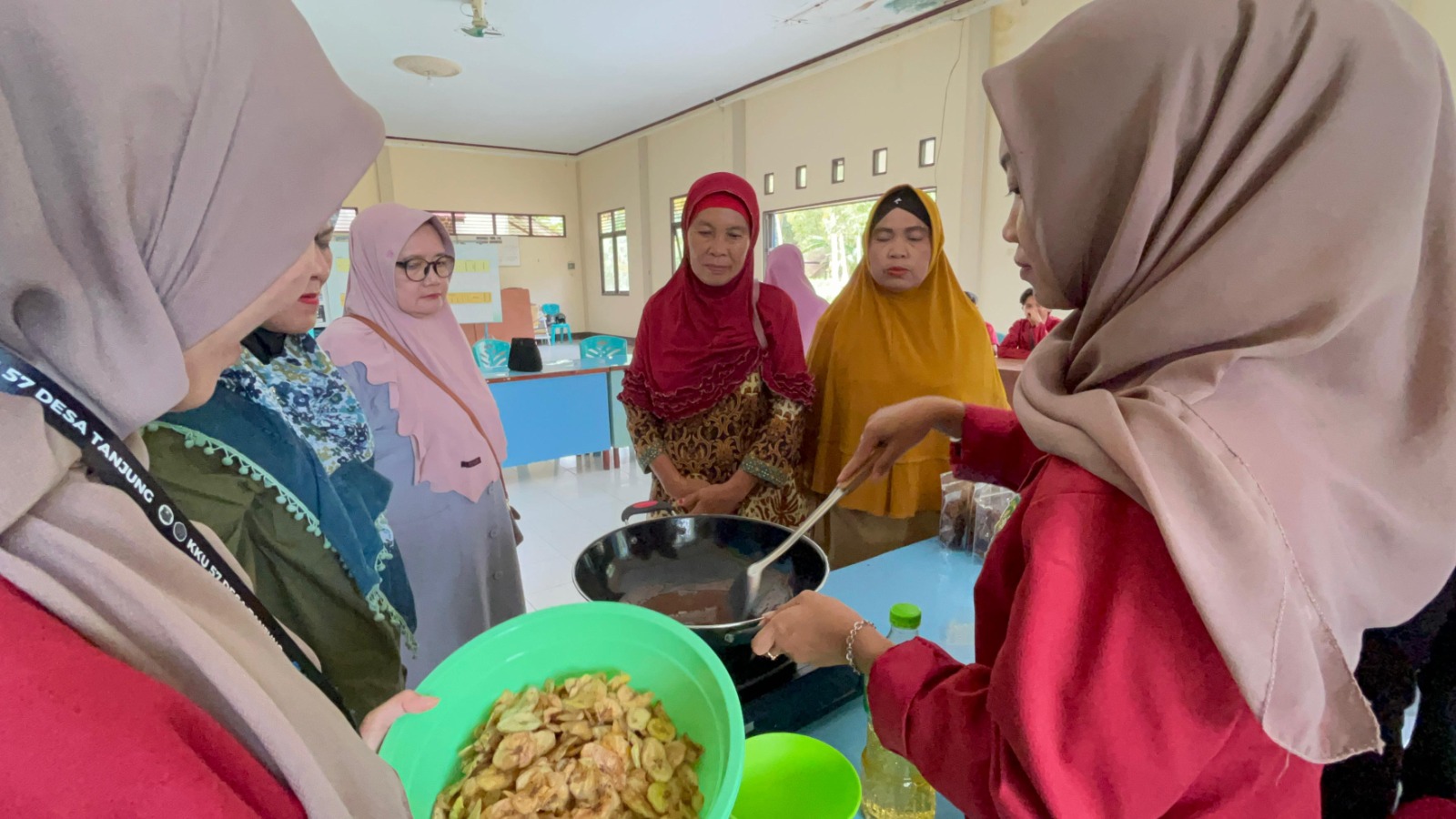 Dalam kegiatan sosialisasi ini, Bendahara KKU 57 Desa Tanjung Universitas Muhammadiyah Pontianak Yunita Tri Wulandari melakukan praktik pembuatan kripik pisang lumer bersama ibu-ibu PKK dan masyarakat.