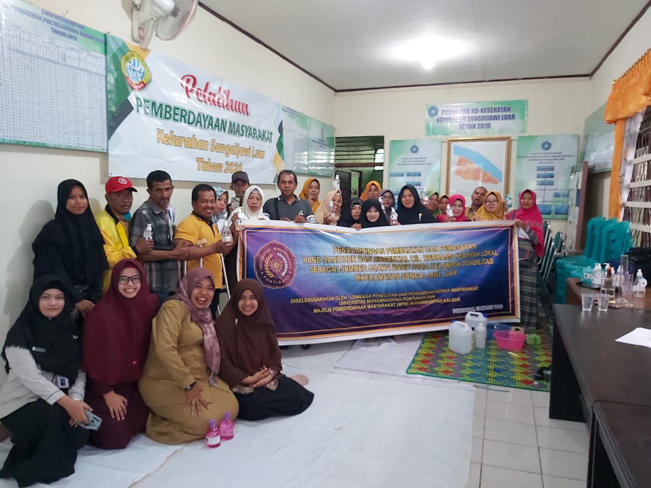 MYKALBAR.COM – Majelis Pemberdayaan Masyarakat (MPM) PW Muhammadiyah Kalimantan Barat dan Lembaga Penelitian dan Pengabdian Masyarakat Universitas Muhammadiyah (UM) Pontianak yang didukung oleh Kelurahan Sungai Jawi Luar mengadakan kegiatan pendampingan, pembuatan dan pemasaran hand sanitizer dan essential oil berbasis kearifan lokal sebagai sumber usaha baru pada kelompok disabilitas di Kelurahan Sungai Jawi Luar, Pontianak Barat, Kota Pontianak, Ahad, 15 Maret 2020.