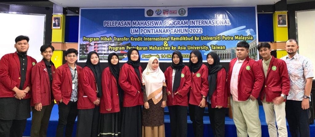 MYKALBAR.COM – Kantor Urusan Internasional (KUI) Universitas Muhammadiyah (UM) Pontianak mengadakan pelepasan mahasiswa yang akan berangkat ke luar negeri. Pelepasan tersebut dilaksanakan di aula lantai 3 UM Pontianak, Jumat 14 Oktober 2022, dengan mengundang Rektor, Wakil Rektor, Dekan dan Kaprodi di lingkungan kampus.