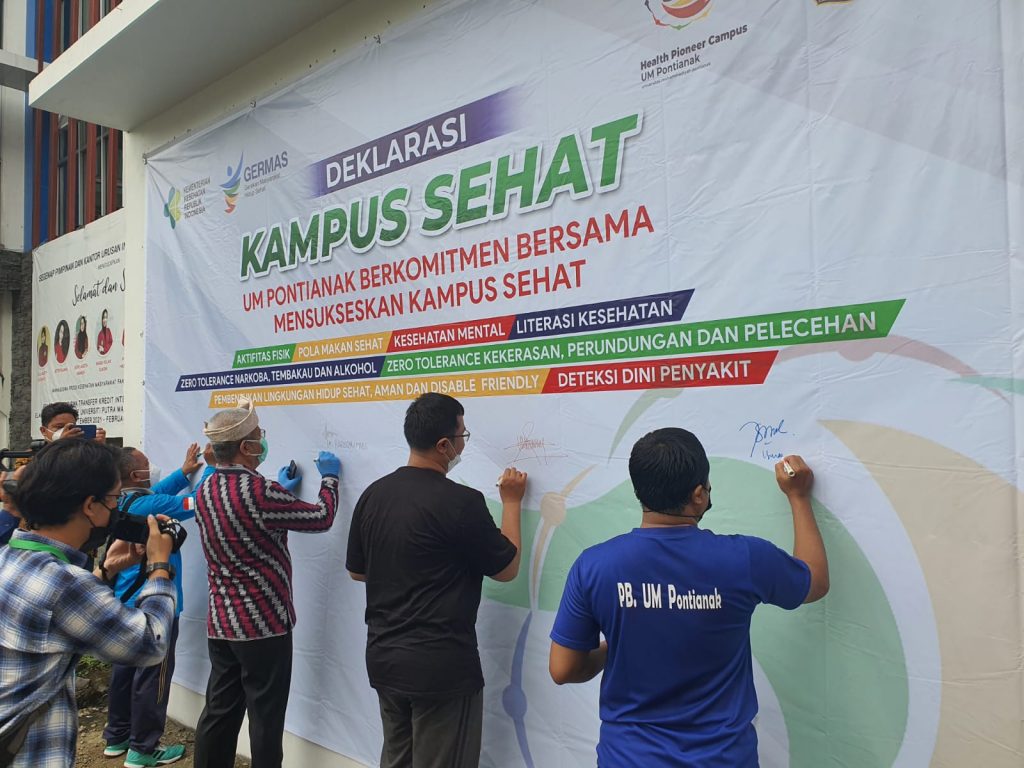 Launching Health Pioneer Campus UM Pontianak dilaksanakan di Aula UM Pontianak, Jl Ahmad Yani, Kota Pontianak, Jumat 22 Oktober 2021 pagi. Launching program ini diawali dengan senam kebugaran, deklarasi Kampus Sehat, dan pemeriksaan kesehatan.